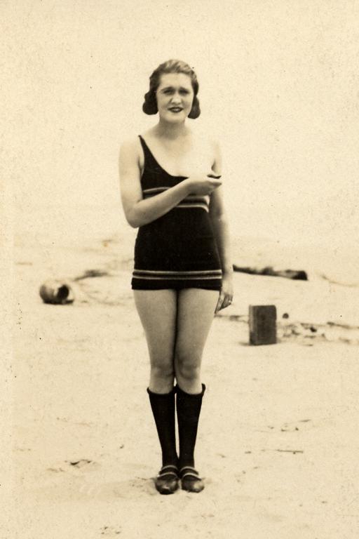 Beach, probably America c. 1923 PC2E10 Costume Stripped maillot pantaloon with hose and shoes. TL. Strapoff. Actions This naughty tease has pulled her strap off her shoulder and threatens to expose her left breast (1). She's also rolled her hose down. Commentary This real beach photo combines a homely woman who has all the look of an amateur--except this is a printed postcard. The left shoulder strap has been unbuttoned at the top and is held in hand--evidence that bathing suit strip tease is by no means a new phenomena. Source Divided back postcard, date is estimation, probably American. Purchased Riverfront Mall, Dover, OH, 2004. 1 picture. |
