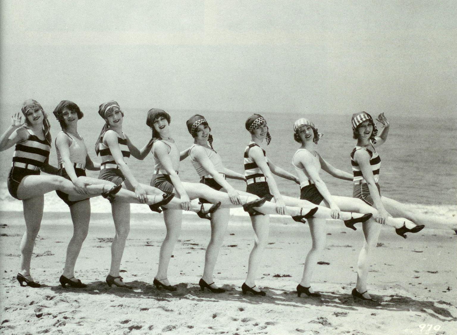 Hollywood, Pacific Ocean, California 1926 MD2650 Costume Striped and solid tank tops and shorts (possibly maillot tanks), with belts. Bathing caps, heels.. TL. Hands on ankles. Actions The Marion Morgan Dancers lineup with left hands on the waist of the gal in front and right hands holding the ankle of the gal behind. The two left-over hands at the front and back of the lineup wave to us and everyone smiles. The touching adds in just a taste of the lesbian; furthermore this chorus line is not on a stage indoors somewhere, but wear bathing suits out on a beach. Commentary The Bikini Scientist observes that as the 1920s go into high gear that the bathing suit / dance costumes have moved beyond the French pinup maillot pantaloon. The silhouettes are tighter, more knit, with joined ensembles and belts. Armholes are defined by shoulder straps. Leg lines are becomming parallel with the crotch, muting pantaloon-ness. Source "The Marion Morgan Dancers during filming of...Almost a Lady, Metropolitan," 1926. Date confirmed by imdb.com and source of picture and credit is Lacy and Morgan, Leg Art, ibid. The picture stars Marie Prevost and Harrison Ford (a different one) and is a "Light romantic 'mistaken identity' comedy," to quote imdb.com. 1 picture. |