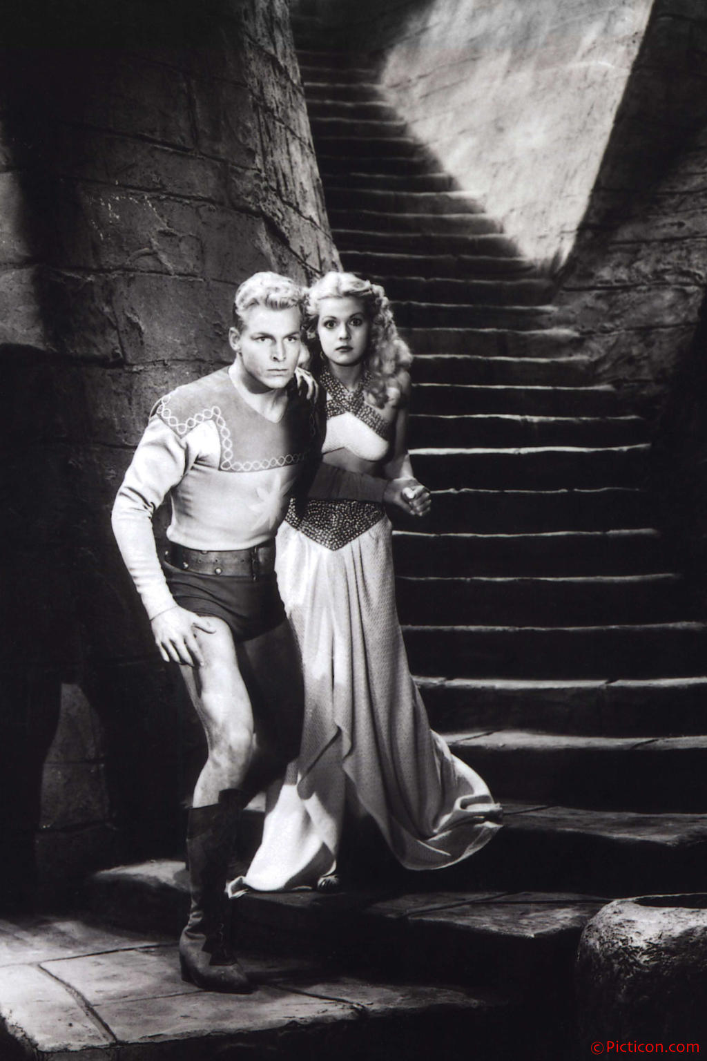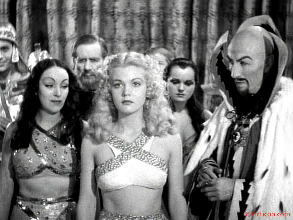 Movie set: Alien Worlds 1936 JR3610 Costume Dale Arden (played by Jean Rogers) wears a halter and long skirt. Princess Aura (Priscilla Lawson) wears a spangled bra and long skirt. Emperor Kala (Duke York, Jr.) wears robes and a helmet. Shark Man (House Peters, Jr.) is bare chested and wears a skirt. Zona (Muriel Goodspeed) wears a low cut narrow strapped bra connected to a long skirt. Flash Gordon (Buster Crabbe) wears a longsleeve tunic and shorts. Boots. Jean Rogers: TM. Bellage. Priscilla Lawson: TM. Bellage. Duke York: None. House Peters, Jr.: TMLC. Muriel Goodspeed: TM. Cleavage, Bellage. Buster Crabbe: L. Actions Flash Gordon (Buster Crabbe) and Dale Arden (Jean Rogers) come down a long flight of stairs (1). Jean Rogers frail posture and trademark revealing halter and skirt endears her to moviegoers; here she stands with her hands back against a wall (2, 3). Captured, a guard probes her forward (4). The bare-midriff Rogers is flanked by Ming the Merciless on her left and the conniving Princess Aura (Priscilla Lawson) on her left, both clad in bare-belly tops, long hair, heels that are quite racy for the 1930s (5). Zona watches on as Emperor Kala and the Shark Man carry an unconscious Dale Arden (6). Princess Aura is Ming's daughter, and vies with Dale Arden for Flash Gordon's affections (7). Commentary Science fiction movies have been a good excuse for a bare midriffs since the late 1920s, and Universal Pictures dishes up a rich helping of them in the Flash Gordon serials. Rogers and Lawson are both former beauty queens, and like Muriel Goodspeed (Zona), maintain bare bellies throughout the science fiction series. Source Flash Gordon, Universal, 1936. Sources include Val Warren, Lost Lands, Mythical Kingdoms, and Unknown Worlds, HM Communications, 635 Madison Ave., New York 10022, distributed by Simon & Schuster, New York, 1979, p. 41; photo collection of Howard Frank of Personality Photos, Box 50, Brooklyn, NY 11230. Also britmovie.co.uk, paranoiastrikesdeep.blogspot.com, thenostalgialeague.yuku.com, users.bestweb.net, and especially doctormacro.info. 7 pictures. |