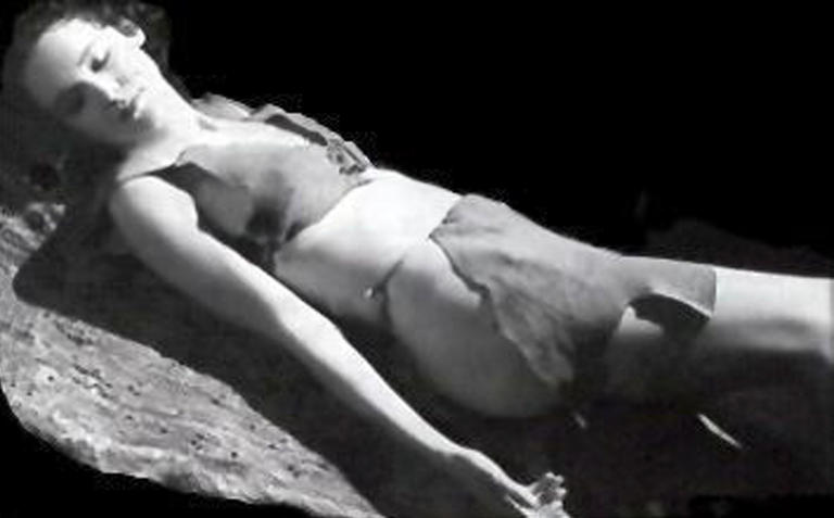 Jungle Movie set, Hollywood, California 1934 TJ3410-70 Costume Jane (Maureen O'Sullivan) wears a leather front-tie croptop bra and side string loincloth deux-pièces. Tarzan (Johnny Weissmuller) is barechested with a sidetie loincloth. Jane: TML. Bellage. N-1, with navel sometimes showing. Armpit. Side of the hip. Tarzan: TMLC. N-1. Shaven chest. Actions Irish-born Maureen O'Sullivan arrives in Hollywood in 1930. In 1932 she signs a contract with MGM and co-stars with Olympic gold medal swimming star Johnny Weissmuller in Tarzan the Ape Man. The movie is a huge success and launches a series of Tarzan movies featuring the sexiest couple in the jungle. These images of Tarzan and Jane are believed to be from the second Tarzan movie, Tarzan and His Mate, released in 1934 (1, 2, 3) Weissmuller chest is shaven and he wears but a loincloth (4, 5, 6). O'Sullivan's costume for the movie is a most revealing two-piece croptop and side-tie loincloth that leaves little to the imagination and which will represent the apex of Jane exposures (7, 8, 9, 10, 11, 12, 13, 14, 15, 16, 17, 18). The leather bra is laced together at the front and the sides and the loincloth and back flap appear to hang from a waistband, baring a wide expanse of hip, and apparently oblivious of any internal structure (19, 20, 21, 22, 23, 24). Weissmuller's chest is shaven and both waistlines engage the navel. The picture includes a scene of Jane trying on hose (25) including a silhouette nude (26). O'Sullivan's top is prone to show off her natural cleavage (27, 28) as well as her natural parts (29, 30). Not untypical of the pre-Hayes code period the original production of the movie includes scenes with Jane topless as well as a nude underwater swimming scene, but this is cut from the picture due to complaints from religious groups. Although O'Sullivan's skimpy costume suggests the ravishing Irish beauty is not shy about showing her body, the underwater nudes are performed by body double and Olympic swimmer Josephine McKim in order to provide a graceful quality to the images. These have been restored to the movie when the picture was rereleased for DVD distribution in 1986. You can differentiate McKim by her smaller breast size; it is uncertain if the nude Jane diving into the water and emerging from it after the skinny dip is Ms. McKim or Ms. O'Sullivan (31, 32). Commentary "Maureen O'Sullivan, as Jane, projects superb femininity in beautiful contrast to Johnny Weissmuller's infallible masculinity in his role as the famed jungle lord," writes Val Warren in Lost Lands. But by the late 1930s the Hays Code is about the exert a major influence on Jane's costume, and the next time Tarzan and Jane make a movie the Hayes Code ensures Jane is more covered up (TJ3910-30). Source Tarzan and His Mate, MGM, 1934. The number 646Xnn may be an MGM identification number for the picture. Many sources including doctormacro.info, flexxxbbs.sytes.net, flickr RickRaven, pictureshowman.com, suspense-movies.com, tarzan.com, theoopsbank.com, ultra-renaissance.com, , uraniumcafe-the.com, and xxxporntalk.com. Additional images found in Val Warren, Lost Lands, Mythical Kingdoms, and Unknown Worlds, HM Communications, 635 Madison Ave., New York 10022, distributed by Simon & Schuster, New York, 1979; photo collection of Howard Frank of Personality Photos, Box 50, Brooklyn, NY 11230. 34 pictures. |