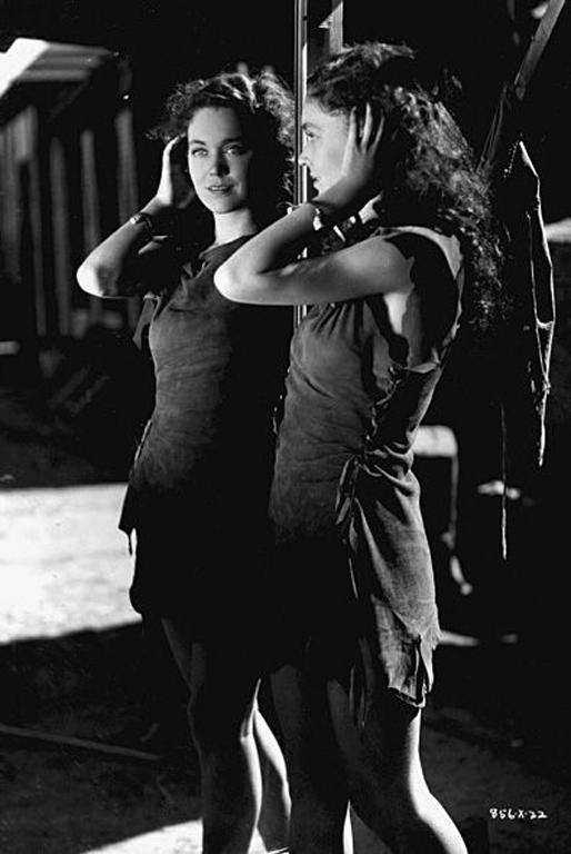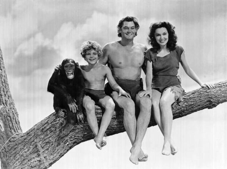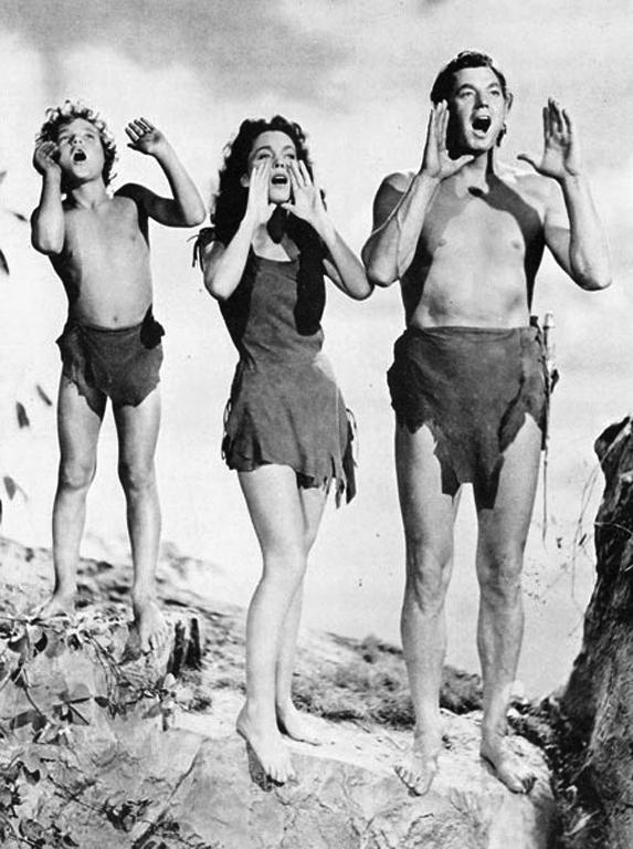 Jungle Movie set, Hollywood, California 1939 TJ3910-30 Costume Jane (Maureen O'Sullivan) wears a leather minidress. Tarzan (Johnny Weissmuller) is barechested with a sidetie loincloth. Jane: TL. Tarzan: TMLC. N-1. Shaven chest. Actions Tarzan Finds a Son introduces another principle player to the cast, along with Cheeta, the chimp (1, 2, 3). Tarzan and Jane interact (4, 5, 6). Jane's new costumes (7, 8, 9, 10). Commentary By 1939 the effect of the Hays code has sunk in and Tarzan's Jane's costume has grown from a revealing croptop and loincloth of the 1934 Tarzan Finds a Mate (TJ3410-70) to a belly and side-of-the hip covering minidress. Source Tarzan Finds a Son, 1939. Images of this picture are frequently confused with images from Tarzan's New York Adventure in 1942, and some of those confusions possibly exist in this page. The numbers MG72072 and 856-X-nn appears on some of these photos and it is possible that similar codes relate to the same movie. 10 pictures. |