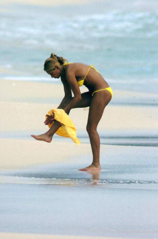 Beach January 2005 AKA516 Costume Yellow string halter and sidestrap bikini. Black bag, towel. Tattoo center back. TML > TMLP (flashing). Cleavage. Inguinal. Hairage. Pubage. N-7 > N-15. Actions This Russian tennis celebrity and fashionite slips out of a miniskirt (1, 2, 3), talks to a friend (4), and walks down the beach wearing a very low-cut bikini(5, 6, 7). But what catches the attention of dozens of websites is when this beauty pulls the front of her bikini down to check her "sandy 'tang," as one site puts it (8, 9, 10, 11, 12), only to discover she is being observed (13). Commentary There is debate as to whether Ms. Kournikova is shaven or trimmed, but in either respect the student of Bikini Science is provided one of those precious candid moments to study the bikini in action. Yellow bikinis are popular this year, but don't confuse Kournikova's candid self-examination with that of another celebrity, Jessica Alba, checking her butt (AJA580). Source Starzhunter.com and many other Internet sites, collected 2007. 13 pictures. |
