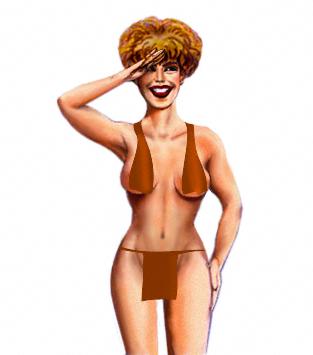 The Loincloth Defined A loincloth is a species of culotte of primitive origin whose name derives from the Latin lumbus, meaning the pelvic region. It consists of a waistband and a flap of cloth which hangs in front of the pubic region (fig. 35-11). Strictly speaking, the cloth does not pass through the crotch; if it did the culotte would be a g-string, not a loincloth. Still worn by millions of people daily, often topless, and including both men (WH188510) and women, the loincloth is a dress staple on the planet. It is wonderfully seductive, hanging freely in front of either sex, obscuring the sex but not prohibiting its viewing from behind, or while the wearer is leaning over. It may also fail to mask aroused behavior, particularly in the male. Loincloth Origins Major details about the origins of the loincloth are found in Time Machine section Primitive Costumes. The loincloth is worn especially in tropical climates by jungle people, as well as by surfers (WH188510). The loincloth has a rich tradition with performers, be they Arab musicians (EG188810) or vaudeville performers (GP2610). And it provides a sexy costume when wants to do modern restages of primitive peoples, e.g., Tarzan and Jane (TJ3410-70, TJ3910-30), or the One Million Years B.C. cave woman (RW196605). With the advent of the topless beach and the reduction of the string bikini the loincloth becomes a pinup reality of beach fantasy (BR197370, BR197390). Its advantage in this milieu is that it puts the pubic hair into play (JE9016B), and like other modern bikinis, adds risk to the equation. Related Costumes It has been said that the loincloth is the merger of the waistband and the fig leaf. In females the loincloth sometimes takes the form of a small apron which covers the genitals (LL5908). The loincloth should not be confused with the g-string, which similarly covers the genitals but which also has a string through the posterior rugae, giving it three edges as opposed to the two edges of the loincloth. Nor should it be confused with the string brief, which, like the loincloth, uses a string waistband, but embodies a closed crotch. Caption The loincloth merges the waistband and the fig leaf and is one of the most widely worn costumes on the planet. |