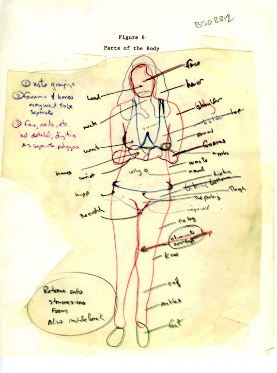 North America 1988 BSD8812 Costume N/a. N/a. Actions Body parts are nomenclatured on this illustration (1). Commentary It is important that the bikini scientist understand the names for the various parts on the body. See BSD8809 for how animating fashion lines uncover and cover the body. Source Judson Rosebush, Bikini Science Hypercard Stack, 1988. 1 picture. |