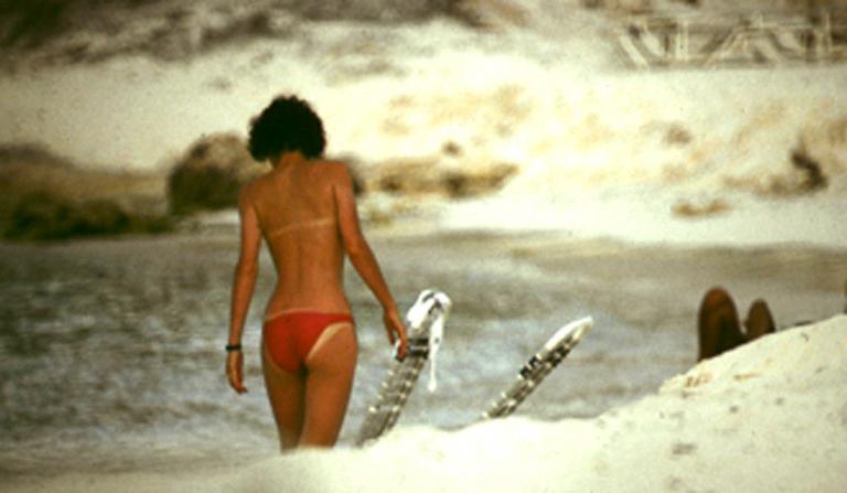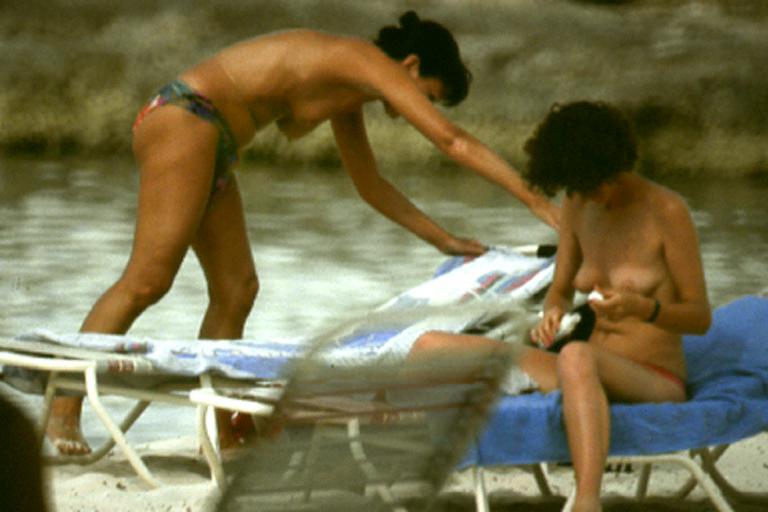 Main Beach, Cancun, Mexico August Friday, 1989 C8902-03 Costume Mother (C8902): Topless blue floral nombril bikini. Belly chain. Daughter (C8903): Topless sidestrap nombril. Mother: TMLB. N-3. Daughter: TMLB. N-4. Armpits. Tan lines mark where a bandeau must have previously been worn. Her briefs also tend to slide around on her suntan, exposing white edges. Actions Although we don't witness it, another onlooker reports that the mother and daughter arrived at the Main Beach by walking from their room, past the main pool and bar, wearing only their bikini briefs. "I couldn't believe it," the onlooker observes. "Walking topless right past the pool all the way down to the beach. And her daughter right there beside her! She must be a French woman because I could never do that." Once at the beach the twosome prepare their chairs (1). The daughter sits, opens her suntan lotion (2), and lotions her legs (3) and her untanned breasts (4). She puts on her sun glasses and reclines with a book. Later a male friend catches the daughter's attention (5) and she arises, goes and sits down next to a him and talks (6). When she leaves him she wanders down along the ocean (7), her culotte casually showing some untanned cheek. Eventually she returns back to her chair (8). Commentary These is the most long-ranging topless subjects at Cancun, and indeed some of the most long rangers in general. The mother's total breast tan and the daughter's total lack of it suggest the mother is more adept at topless performances. Source Wildlife. 8 pictures. |