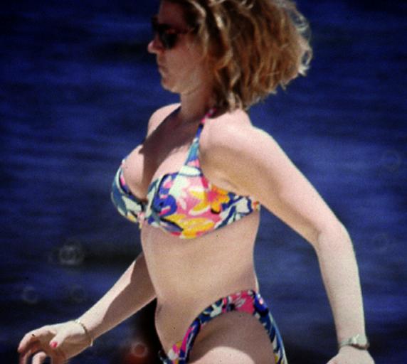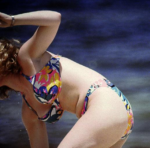 Picnic Two, Cancun, Mexico August 1989 C8964 Costume Purple shirt tied belly-up over blue multicolor underwire molded halter and strapped v-kini. ML > TML. Cleavage. N-3. Actions This Party Girl sits on the boat with her shirt tied at her belly (1), adjusted so that her navel is carefully displayed (2). Once ashore and into the swing of the party games she doffs her shirt (3) to reveal a constructed halter underneath (4). She chugs her beer in the drinking contest, pauses (5), and sprints toward the pole (6), spins around it (7, 8), and heads back again (9) at full speed. She gives a victorious, toothy grin afterwards as she stands next to a hairy-chested guy (10). Commentary The bandeau and v-kini is the most common costume at the picnic today, but this party girl's choice of an uplifting foundation that also contains her cleavage allows her to exhibit her full athletic ability. Source Wildlife. 10 pictures. |