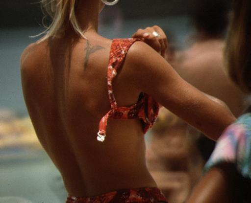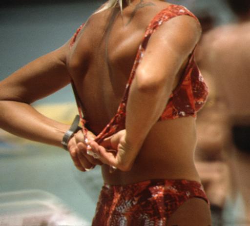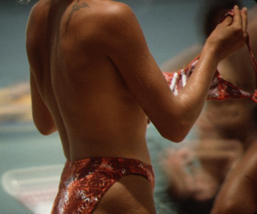 Rock 'n' Roll Beach, Martinique March Sunday, 1992 M92353 Costume Multicolor geometry patterned nombril topless. Orange and black bra and culotte over multicolor culotte. Black and white polka-dot bra and culotte over multicolor culotte. Earrings and watch. TMLB. N-2. Tattoo on shoulder. TMLB don TML doff TMLB [repeat]. Actions A swimsuit peddler, topless and wearing a nombril bikini holds a white top in her hand (1). She dons an orange and black culotte (2) and then dons a bra top (3), back strap fastens it (4), and turns and from the front adjusts the straps (5). Note the edge of the multicolor culotte underneath (6). Then the peddler doffs this top and bottom and dons a while and black polka-dot bra and culotte (7). She doffs the soutien-gorge and looks at the camera, first person, in the midst (8), but continues to make herself topless (9). She then doffs the polka dot culotte off over her work culotte (10). Commentary Still another swimsuit peddler has descended on the rock'n'roll beach. This one wears a full-bottomed brief, unlike another peddler nearby (M92356), or the one off to the south (M92017). Source Wildlife. 10 pictures. |