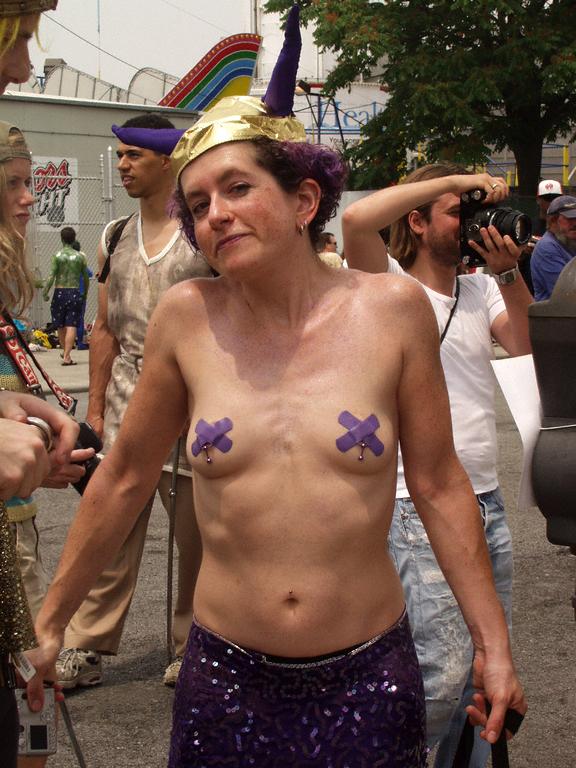 Mermaid Parade, Coney Island, New York June 26, 2004 MP4090 Costume Purple tape pasties and skirt. Headdress. Pasties appear to be taped over nipple rings. Navel barbell. Ring in side of nose. TM. N-3. Surrounding cleavage. Areolage. Actions A young warrior stands in her spiked helmut (1). We catch her attention (2) as she holds a camera (3), and she poses for us (4), and takes a picture (5). A shot of just her torso (6) moves in to examine her pasties and nipple rings (7); right (8) and left (9). Commentary What makes the set unusual are the purple tape pasties over nipple rings. Source Wildlife. 9 pictures. |