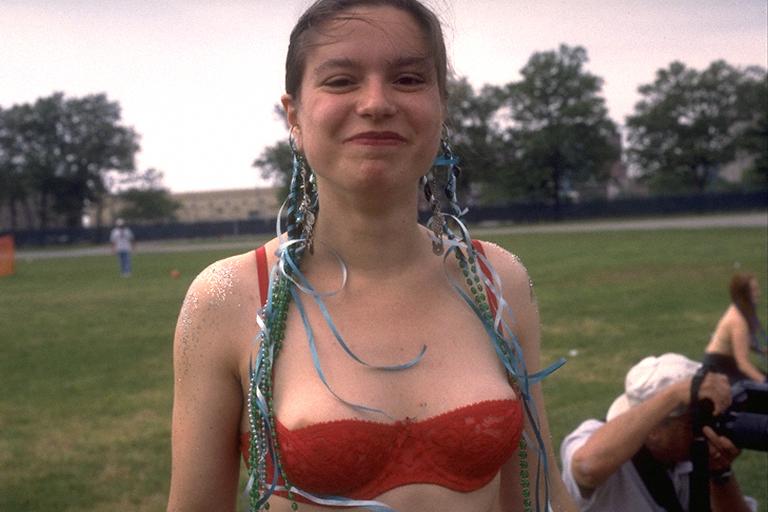 Mermaid Parade, Coney Island, NY June 22, 1996 MP9611 Costume Red underwear bra and red dress over blue shorts. Sparkled bare breasts and beads, and red dress over blue shorts. TML. N-1. TMLB. N-1. Actions This mermaid arrives wearing a red underwear bra (1, 2), which she doffs (3) before covering her breasts with sparkle (4, 5). She grins knowingly (6). Commentary Other mermaids are also decorating their topless breasts (MP9609) and marching in the parade (MP9664). Source Wildlife. 6 pictures. |