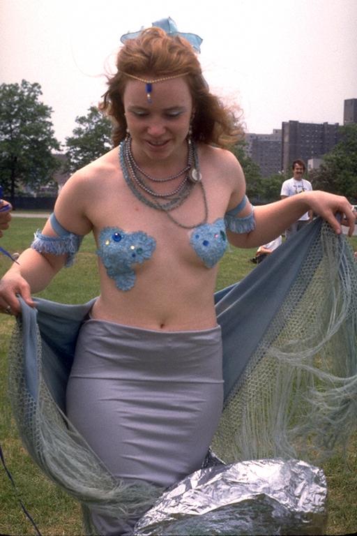 Mermaid Parade, Coney Island, NY June 22, 1996 MP9641 Costume Blue applique pasties and skirt with tail. Armbands, necklaces, headband. ML. N-1. Actions When you catch a glimpse of this mermaid from the back or the side one is not sure if she is topless (1) or just wearing pasties (2). This mermaid wraps a shawl around her tail (3, 4). Commentary Like MP9608, this mermaid prepares for the hike down Surf Avenue. But hold on, here come two more (MP9650). Source Wildlife. 4 pictures. |
