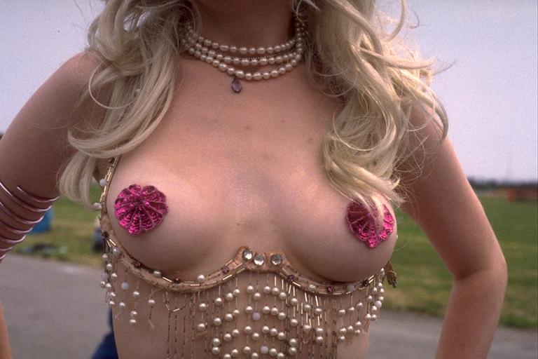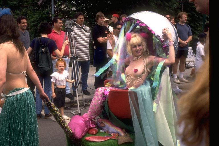Mermaid Parade, Coney Island, NY June 22, 1996 MP9650 Costume MP9650: Violet pasties and tanga. Headpiece, necklace, armband. Same with metal quarter-bra and skirt overtop. MP9651: Blue star pasties and tanga. Silver false eyelashes, green lipstick, earrings. Blue body paint. Navel pasty. Eyeglasses tattoo on right buttocks. Same with clear wrap skirt overtop. MP199650: TMLA > TM. N-2. Armpits. MP199651: TMLA > TM. N-1. Actions Two mermaids arrive at the staging area wearing pasties and tangas and scramble to get ready (1). One comes in red (2, 3, 4); her pasties are round and her otherwise bare breasts are supported by underwire (5). The one in the blue tanga (6) has a tiara (7), a pasty in her navel (8), and a small tattoo on her butt (9, 10). Her pasties are star-shaped (11). The twosome wrap themselves in their tails (12, 13) and snuggle into a float. Once in the parade (14, 15) they will be pulled along by a human beast of burden named Chet (16). They wave as the crowds cheer (17, 18, 19). After they finish the judging they pose for pictures, two at a time (20). Commentary Pasties have previously been spotted today (MP9641), and more will also be spotted along the parade route (MP9692)! Source Wildlife. 20 pictures. |