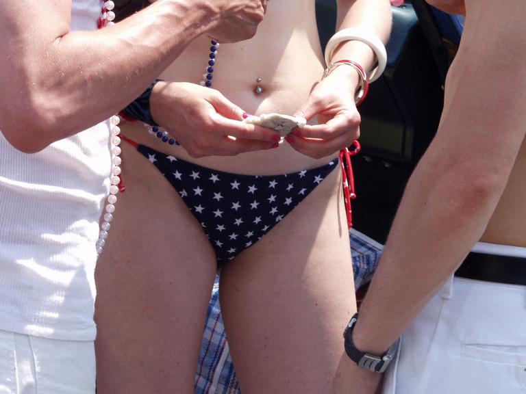 Mermaid Parade, Coney Island, NY June 23, 2002 MPA230 Costume Red stars string halter and blue stars sidetie string culotte. Blue headdress. Necklaces. Red, white and blue wristbands. Red and white socks, red heels. Tattoo on center back. Navel pierce. TML. N-5. Buttage. Actions This all-American (1) headlines a foursome that brings a flag and sailor theme to this year's Mermaid Parade (2). Here in the staging area the team augments natural tattoos (3) with temporary ones (4) on the chest (5) and the butt (6, 7). The sailor boys discuss tattoos also (8, 9, 10) and they are put on their chest (11, 12). These costumes have lots of detail, like the wristbands (13), the navel piercing (14), an elaborate lower back tattoo (15, 16), a string tie (17), and matched socks and shoes (18). Commentary The Stars and Stripes Mermaid (here), the Aqua Blue Pasties and Dress Mermaid (MPA231), the Lobster Boy (MPA232) and the Halter Guy all join up on the American Quartet float (MPA233). Source Wildlife. 18 pictures. |