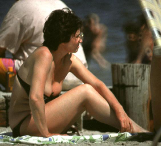 Jacob Riis Park, New York June 1988 RP8805 Costume Very low-cut black halter neckstrap untie to bandeau and sidestrap nombril. Sunglasses. TML. N-4. cleavage décolleté. Actions A slightly overweight sits with her neckstrap tied (1) and then untied (2, 3). She stands and takes off her sunglasses (4) (5). Ricky business. An ocean liner goes by. Commentary Cleavage is a major theme at Riis Park this year. And one way to accentuate cleavage is to untie the halter strap. Source Wildlife. 5 pictures. |
