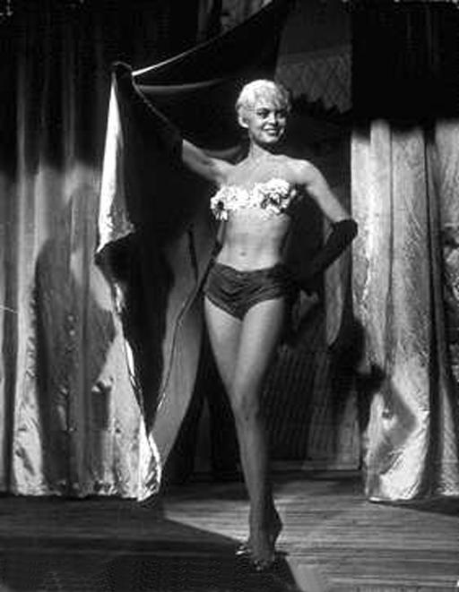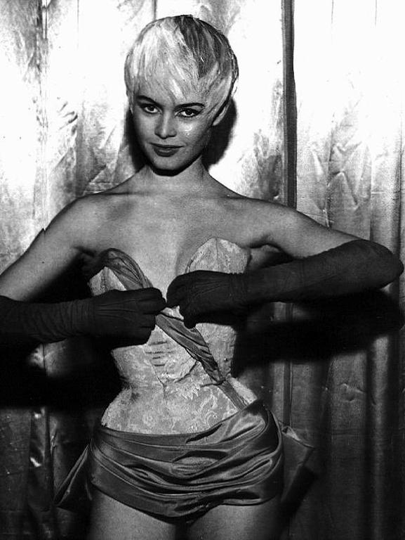 Film Set, France 1956 BB5610 Costume Strapless maillot with sash and back bow-tie. Silver pumps. Long gloves. Flower pedals bandeau and black panties. TL. Armpit. TML. N-2. Actions Ms. Bardot models her hourglass figure in this elegant, waist-pinching, one-piece suit (1). Turns out this is actually a striptease act (2), and soon our leading lady is down to her underwear (3). Commentary Bardot is still at a stage in her career when she is not taking everything off. Striptease is also a theme other stars will repeat. Source Publicity stills from Marc Allegret, director, En Effeuillant la Marguerite, 1956. From Pierre Billard,Vamps, Societe d'Editions R.T.M. (Cinema, Art du Siecle), Paris,1958, and the Internet, 2002. 3 pictures. |