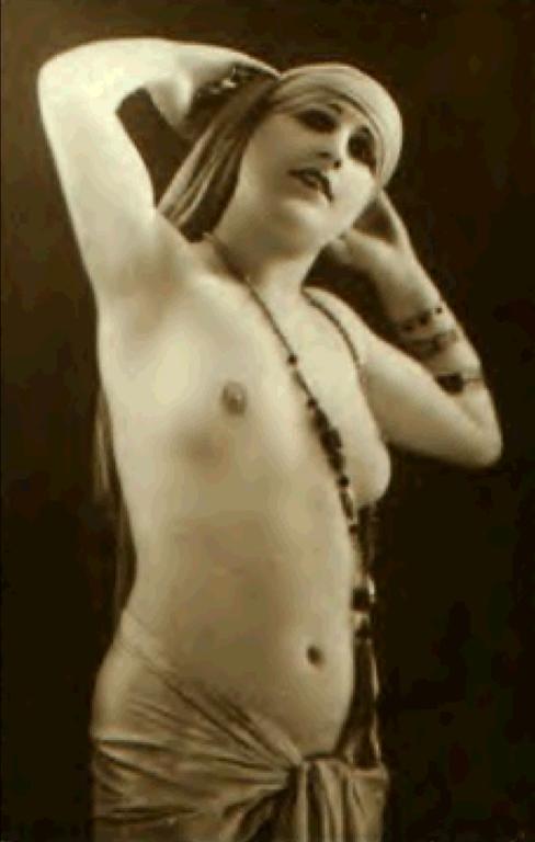 Paris c. 1911 MH191110 Costume Topless and tied sarong skirt. Headband, necklace, armbands. TMB. N-3. Armpits. Actions This rare topless image of the Mata Hari captures her trademark of V-belly below her navel (1). Commentary Topless poses in the early two decades of the 20th century are common in Paris and is the rule for all showgirls. (Indeed full nudity is expected of lesser-known talents.) Headliners like Mata Hara and Josephine Baker who choose to dance and model topless only amalgamate their fame. Source Collected from the Internet. Date is estimation. 1 picture. |